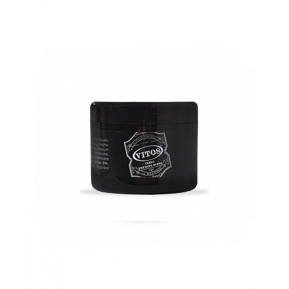 Крем до і після гоління Vitos зі пом'якшуючим та освіжаючим ефектом, формула на основі гліцерину для пом'якшення шкіри, з додаванням камфори для загоюючої дії та ментолом для тонізування та приємного освіження до та після гоління.