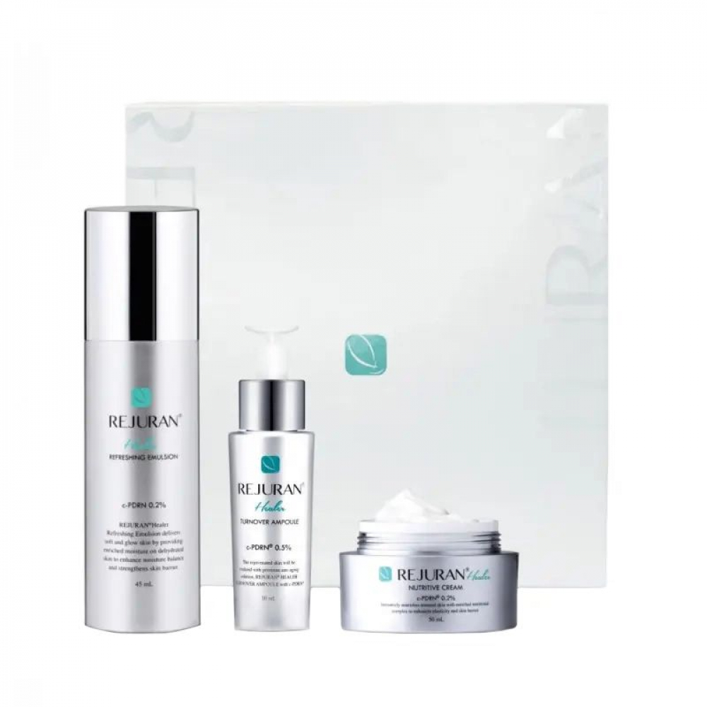 Набір для догляду та сяйва шкіри Rejuran Healer Glow-Up Skincare Set містить тріо розкішних доглядових продуктів, що забезпечують підтримку здоров'я і молодості епідермісу зсередини.